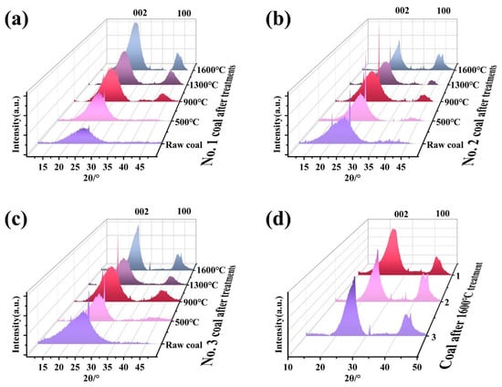 During the heating process, the microcrystalline structure of coal changed. The XRD results for the three coals after heat treatment at different temperatures are shown in Figure 6. There were two obvious bands, the 002 band between 20 and 30° and the 100 band between 40 and 50°. The 002 peak reflected the layered structure of the carbon material and the degree of stacking. The higher the degree of stacking, the more ordered the structure. The positional offset of the 002 peak determined the interlayer distance in the stacked crystalline carbon. With an increase in temperature, the coal removed volatile matter, and the cross-linking reaction promoted the arrangement of the carbon layers. With a further increase in temperature, dehydrogenation and aromatization further enhanced the stacking and ordering of the carbon layers []. In Figure 6d, it is shown that all three coal samples underwent obvious crystalline growth and stacking changes in the layer structure after the high temperature treatment at 1600 °C. The sharp peaks with short-range ordering appeared in No. 2 and No. 3 coals, indicating that No. 2 and No. 3 coals showed graphitic-like phenomena. The 002 peaks of the No. 1 coal showed a microcrystalline structure with a long-range disorder. The 100 peaks reflected the planar arrangement of the carbon atoms. With increasing temperature, all three coals showed 100 peaks. This indicated that the coals showed two-dimensional structure ordering and crystal growth with an increase in temperature.