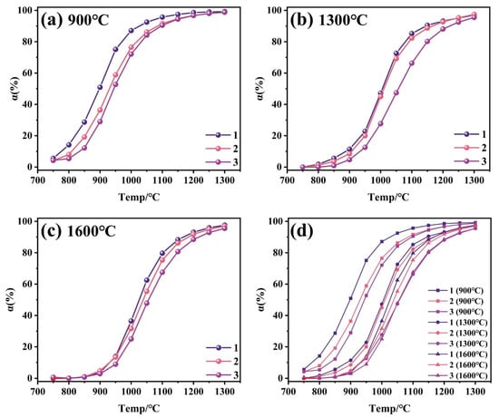 The higher ordering of coal reduces the reactivity of coal and thus affects the productivity of MG-Si. Coal is mainly involved in reactions at high temperatures during the production of MG-Si. Therefore, the reactivity at high temperatures is more reflective of the actual conditions of the coal. In this study, coal coke treated at 900, 1300, and 1600 °C was selected for reactivity determination. The results are shown in Figure 8a–c. The reactivity of coal coke treated at 900 °C, 1300 °C, and 1600 °C was 1 > 2 > 3, which was consistent with the degree of coal ordering. The variation in the reactivity with temperature for the three coals is shown in Figure 8d. All three coals exhibited a decrease in reactivity with increasing treatment temperature. This was mainly due to the increasing degree of coal ordering and decreasing reactivity with increasing treatment temperature. The reactivity curves of the No. 3 coal at 1300 °C and its reactivity curve at 1600 °C were very close to each other and almost coincided. This indicated that No. 3 coal has a significantly ordered structure after 1300 °C treatment, resulting in lower reactivity than No. 1 and No. 2 coals.