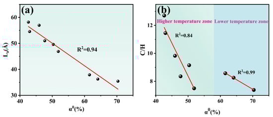 Correlation between reactivity and structure: (a) correlation between the average reactivity α0 and La of coal; (b) correlation between the average reactivity α0 and C/H of coal.