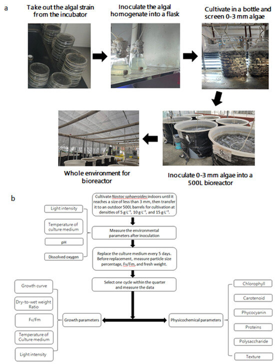 Seed production and large-scale cultivation process (a) of Nostoc sphaeroides. (b) Cultivation and evaluation processes in this study.
