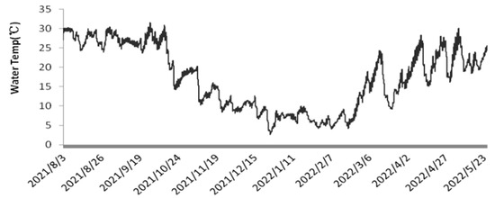 As shown in Figure 2, the light intensity at 12:00 during outdoor cultivation varied significantly across seasons. In summer, it ranged from 9.9 to 876.3 μmol·m−2·s−1; in autumn, from 63.3 to 510.7 μmol·m−2·s−1; in winter, from 26.2 to 946.2 μmol·m−2·s−1; and in spring, from 68.7 to 1316.2 μmol·m−2·s−1. From August to October, shading nets were used, resulting in lower light intensity above the plastic bioreactors compared to spring. However, during cloudy or rainy days, the shading nets were removed to ensure sufficient light intensity [25]. In late February, the light intensity remained above 600 μmol·m−2·s−1 for most of the time. As illustrated in Figure 3, the temperature of the culture medium in the plastic bioreactors fluctuated with seasonal and diurnal variations [26]. The temperature ranged from 23.7 to 31.3 °C in summer, 7.1 to 19.9 °C in autumn, 3.7 to 23.8 °C in winter, and 15.2 to 29.6 °C in spring.
