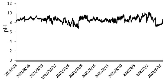 As shown in Figure 4, the dissolved oxygen levels ranged from 6.0 to 9.1 mg·L−1 during August to October, 6.7 to 13.3 mg·L−1 during November to December, 8.1 to 15.2 mg·L−1 during January to March, and 6.8 to 11.1 mg·L−1 during April to May. The relatively low dissolved oxygen values observed from August to October were due to high temperatures, with the lowest recorded at 6.0 mg·L−1. Similarly, the fluctuating light intensity and unstable temperatures in April to May also contributed to lower dissolved oxygen levels. As shown in Figure 5, the pH values during the cultivation of N. sphaeroides fluctuated between 7 and 10, with an average of approximately 8.5. This indicates that the outdoor cultivation environment for N. sphaeroides was slightly alkaline.