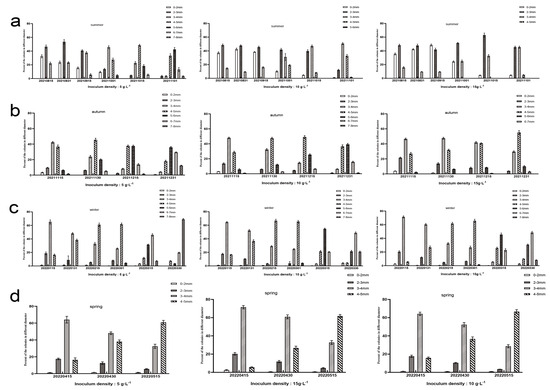 From January to March, for the group with an inoculation density of 5 g·L−1, the largest colony size was 7–8 mm, accounting for 69.58%; for the group with an inoculation density of 10 g·L−1, the largest colony size was 6–7 mm, accounting for 48.88%; for the group with an inoculation density of 15 g·L−1, the largest colony size was 6–7 mm, accounting for 48.87%.