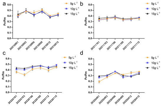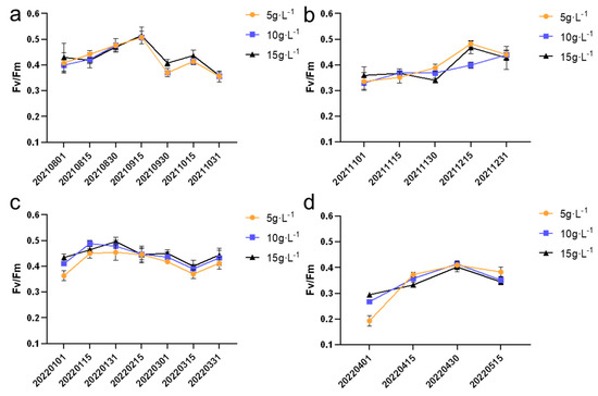 In contrast, from November to December and from April to May, the highest Fv/Fm values were observed in the group with an inoculation density of 5 g·L−1, with values of 0.48 ± 0.01 and 0.37 ± 0.01, respectively. These results indicate that lower inoculation densities may be more favorable for maintaining better photosynthetic efficiency during these colder months, possibly due to environmental factors such as lower light intensity and temperature fluctuations.