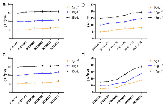 As shown in Figure 8, during the summer, autumn, and winter seasons, the growth rates at different inoculation densities were relatively similar, with biomass increasing at a slow pace. In contrast, the growth rate during the spring season was the fastest. In spring, the growth rates of colonies at different inoculation densities remained steady during the first six days, but starting from the sixth day, the growth rate for the 5 g·L−1 and 15 g·L−1 groups began to increase rapidly. Meanwhile, for the 10 g·L−1 group, the growth rate started to accelerate around day nine. This suggests that spring provides an optimal environment for growth, particularly as the inoculation density increases, indicating a possible seasonal variation in the response to cultivation density. In Figure 8a, the summer inoculation density of 5 g·L−1 showed significant differences (p < 0.05) between samples 20210815 and 20210803. In Figure 8b, the autumn inoculation density of 5 g·L−1 exhibited significant differences (p < 0.05) in the growth curve of N. sphaeroides between 20211115 and 20211103. For the 10 g·L−1 inoculation density, significant differences (p < 0.05) were observed in the growth curve of N. sphaeroides at 20211103, 20211109, 20211112, and 20211115, while the 15 g·L−1 inoculation density showed significant differences (p < 0.05) at 20211103, 20211109, and 20211115. In Figure 8c, the autumn inoculation density of 5 g·L−1 displayed significant differences (p < 0.05) in the growth curve of N. sphaeroides at 20211115 compared to the preceding five time points. For the 10 g·L−1 inoculation density, significant differences (p < 0.05) were observed at 20211103 and 20211115, while the 15 g·L−1 inoculation density showed no significant differences. In Figure 8d, all three inoculation densities exhibited significant differences (p < 0.05) across the six time points.