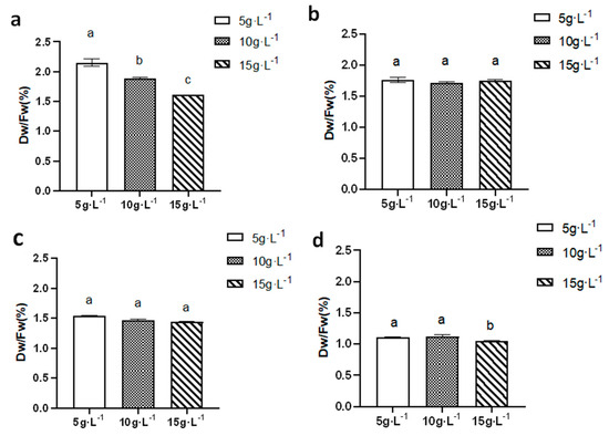 The dry-to-wet weight ratio in (a) summer, (b) autumn, (c) winter, and (d) spring (n = 3). (a, b, and c are marked for significant difference analysis, and the mean values decrease successively from a to c).