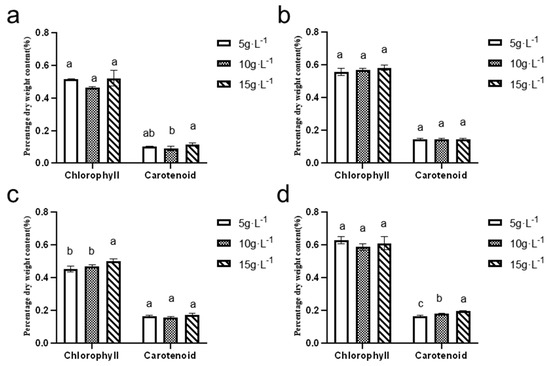 Dry weight content of chlorophyll and carotenoids in (a) summer, (b) autumn, (c) winter, and (d) spring (n = 3). (a, b, and c are marked for significant difference analysis, and the mean values decrease successively from a to c).