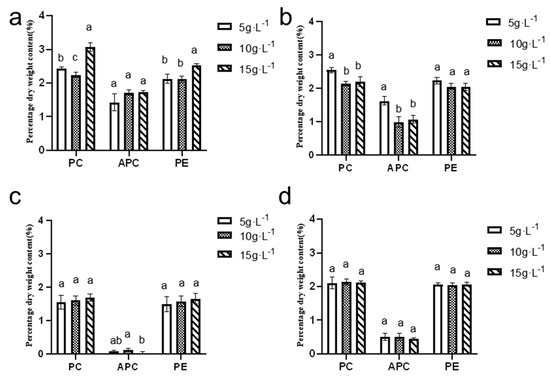 Dry weight content of phycobilin in (a) summer, (b) autumn, (c) winter, and (d) spring (n = 3). (a, b, and c are marked for significant difference analysis, and the mean values decrease successively from a to c).