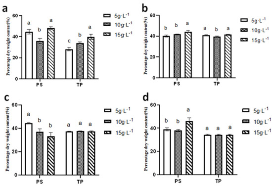 These findings highlight the seasonal variations in the dry-to-wet weight ratio of N. sphaeroides and the influence of inoculation density on biomass efficiency, suggesting that optimal inoculation densities may vary with the season to maximize the growth potential of N. sphaeroides under different environmental conditions. Statistical analysis demonstrated significant differences (p < 0.05) in dry weight content of N. sphaeroides among the three inoculation densities during summer cultivation. In spring, while distinct variations (p < 0.05) were observed between the 15 g·L−1 group and both the 5 g·L−1 and 10 g·L−1 inoculation densities, no statistically significant divergence (p > 0.05) was detected between the 5 g·L−1 and 10 g·L−1 treatment groups.