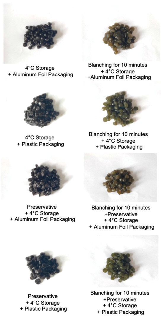 N. sphaeroides harvested in spring was stored for one week under several preservation conditions, including vacuum sealing with aluminum foil and plastic packaging, direct storage at 4 °C, and storage at 4 °C after a 10-min blanching treatment. Additionally, potassium sorbate was added to some of the samples as a preservative to assess its impact on the preservation process (Figure 14).