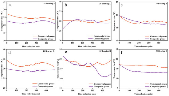 Micro-spalling and electrical erosion in generator bearings cause localized surface damage, increasing frictional forces and heat generation, thereby further affecting bearing temperature rise and vibration characteristics [20]. Meanwhile, damage to the bearing surface can also lead to the breakdown of the lubricating oil film, increasing wear and ultimately reducing the operational efficiency of the wind turbine [3,4]. To investigate this effect in depth, this experiment compared and analyzed the temperature rise differences in the generator’s A-end and B-end bearings under rated speed conditions when using composite grease versus commercial grease, as shown in Figure 1. The test results indicate that the temperature rise of generator bearings using composite grease was significantly lower than that using commercial grease across multiple units (e.g., wind turbine units 1#, 2#, and 3#). In contrast, the performance of commercial grease was slightly inferior in this regard, resulting in a higher bearing temperature rise. This is mainly due to the excellent anti-wear properties of the composite grease, which effectively reduces the heat generated by friction and wear. It should be noted that in Figure 1b,c, the temperature rise curves of the two greases are closer at certain periods of time, but on the whole, the composite grease still shows better temperature rise control under most operating conditions.