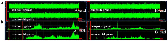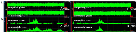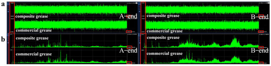 The vibration monitoring system data for bearings using composite grease and commercial grease were extracted, as shown in Figure 2, Figure 3 and Figure 4. Significant changes in the vibration characteristics of the generator bearings were observed in wind turbine units 1#, 2#, and 3#. Specifically, in the time-domain analysis, the data for commercial grease exhibited noticeable high amplitudes and irregular fluctuations, reflecting surface defects such as micro-spalling or electrical erosion. These defects increased the instability of rolling friction, leading to intensified fluctuations in the time-domain waveforms. In contrast, the time-domain signals for composite grease showed significantly reduced fluctuations, lower amplitudes, and overall smoother waveforms. This change indicated that the composite grease effectively eliminated surface defects in the bearing raceways, thereby significantly reducing vibrations caused by surface irregularities and friction imbalance. In the frequency-domain analysis, the spectral data for commercial grease displayed numerous high-frequency components and significant broadband noise, resulting from resonant phenomena induced by micro-spalling or electrical erosion defects on the raceway and roller contact surfaces. Conversely, the high-frequency components for composite grease were markedly reduced, with the spectral distribution becoming more concentrated and broadband noise significantly diminished. Among the units, wind turbine units 1# and 2#, which had larger initial defects, showed particularly notable improvements in vibration amplitude and high-frequency components. In contrast, unit 3#, which had a relatively better initial condition, exhibited a slightly smaller improvement, though the overall trend remained consistent. This further demonstrates the effectiveness of composite grease in eliminating contact surface defects and optimizing lubrication conditions, thereby improving the operational state of the friction pair and significantly suppressing the generation of high-frequency vibrations.