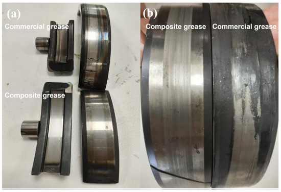 Enlarged photographs of (a) overall and (b) bearing races using composite grease and commercial grease.
