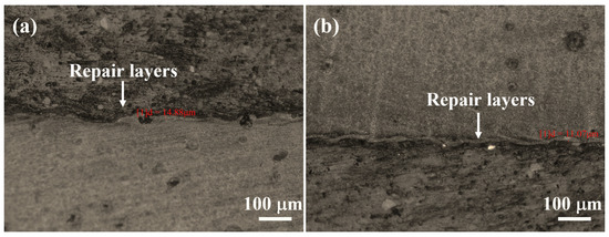 As shown in Figure 6, the surface of the raceway with composite grease formed a repair layer with thicknesses of 14.88 and 11.07 μm, and the surface roughness was 0.45 μm, indicating that a uniform and stable boundary lubrication film was formed during the lubrication process, which helped to inhibit the expansion of microscopic damage. Additionally, as shown in Table 2, the average surface hardness and modulus of the bearing raceways using composite grease are 6.174 and 204.439 GPa, respectively. The measurement results indicate that the hardness and modulus of the raceways using composite grease exhibit good uniformity, with minimal fluctuations among the three measurement points. The raceway hardness values and modulus of the composite grease in the repair layer showed good numerical levels, helping to resist wear and fatigue during rolling contact [21,22]. These mechanical properties reflect that the composite grease has good stability and reliability under long-term high-speed operation conditions, providing a strong guarantee for the long-term stable operation of wind turbines.