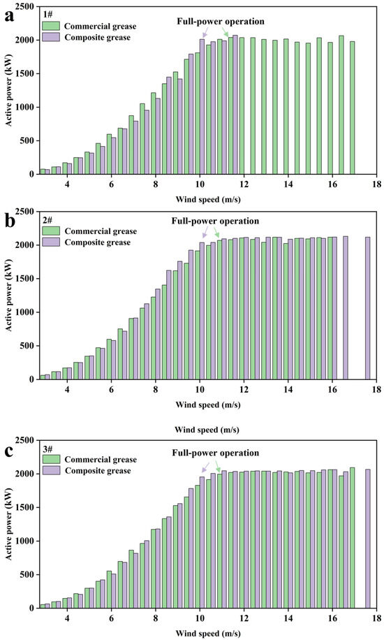 The power curves of units 1#, 2#, and 3# were extracted, as presented in Figure 7. At a wind speed of 10 m/s, all three units operating with composite grease achieved full power output. This enhancement is attributed to the formation of a stable boundary lubrication film by the composite grease on the frictional interfaces, which effectively mitigates the adverse effects of wear and surface roughness on turbine performance. Additionally, it minimizes energy losses and mechanical degradation caused by friction. In contrast, when using commercial grease, units 1#, 2#, and 3# required wind speeds of 11.5, 11, and 11 m/s, respectively, to reach full power output. This difference primarily results from the inferior strength and shear resistance of the lubrication film formed by commercial grease under high-load and high-shear conditions, limiting its ability to reduce frictional losses at lower wind speeds. More importantly, under the same wind speed conditions, units using commercial grease relied on higher wind speed inputs to compensate for power deficits caused by frictional losses. Therefore, composite grease demonstrates clear advantages in minimizing frictional losses and enhancing the operational efficiency of wind turbine units.