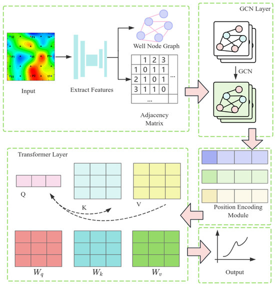 Model establishment. Build a GNT surrogate model to predict the WWCT of each production well. The model architecture is shown in Figure 2. It is mainly divided into the following modules: the Graph Convolutional Network (GCN) layer, the Position Encoding Module, the Transformer Encoder Module, and the final Prediction Module. In the GCN layer, spatial features are extracted from the graph structure of reservoir data. The input data include the node feature matrix, adjacency matrix, and edge features. The node feature matrix describes the attribute information of each well (such as well type, permeability, porosity, injection volume, and production volume), the adjacency matrix describes the connection relationships between wells, and the edge features describe the connectivity parameters between wells (such as transmissibility and connection volume). The GCN convolution operation is achieved by aggregating the node features of the graph structure with the features of their neighboring nodes. The feature update process for each node depends on the feature information of its neighboring nodes. Since the edge features between well nodes also influence the production dynamic indicators, this paper adopts an edge feature-enhanced message-passing mechanism in the GCN layer, introducing edge features into the information propagation process. When aggregating neighboring node features, the edge features are weighted to adjust the strength of information propagation between nodes: