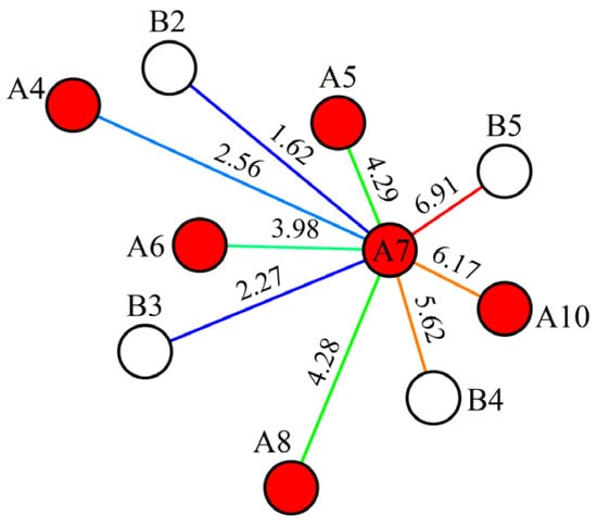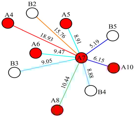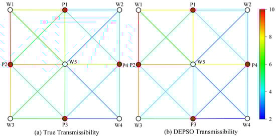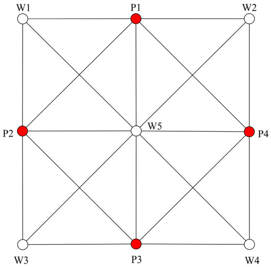 The two-dimensional heterogeneous conceptual reservoir model is established, and Figure 4 illustrates the well locations and their connectivity within this model. The reservoir parameters are set as follows: The reservoir contains 5 injection wells and 4 production wells. The reservoir thickness is 8.5 m, the porosity is 0.3, and the average permeability is 950 mD. The initial reservoir pressure is 8 MPa, with viscosities of 43 mPa⋅s and 1.1 mPa⋅s for crude oil and water, respectively. The compressibility of crude oil is 2.365 × 10−5 MPa−1, the compressibility of formation water is 6.358 × 10−5 MPa−1, and the compressibility of rock is 17 × 10−5 MPa−1.