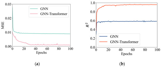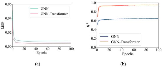 The GNN surrogate model and the GNT surrogate model were trained separately, and the training loss values of both models were recorded. The results are shown in Figure 5. It was observed that, as the number of training epochs increased, the loss values of both models gradually decreased and tended to stabilize. The training loss value of the GNT model was lower compared to that of the GNN model. In terms of model evaluation, the R2 score of the GNN model approached 0.6, while the R2 score of the GNT model exceeded 0.95, demonstrating higher prediction accuracy. The accuracy of the surrogate models was validated using test data, as shown in Figure 6. The GNT surrogate model outperformed the GNN surrogate model, providing accurate predictions and being capable of replacing the numerical simulation process in AHM.