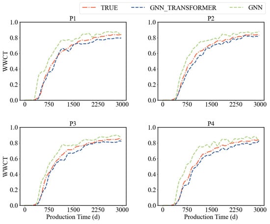 Similar to the conceptual model, 1500 samples were used as training data, and 500 samples were used for testing and validation. Each data file was processed into 150 graph data points based on a production period of 4500 days and a time step of 30. The model input parameters included node features, edge features, and a relationship matrix, while the output was the WWCT for each production well. The surrogate model based on a GNN and the surrogate model based on GNT were trained separately. The loss values and correlation coefficient scores for each epoch were recorded for comparison, as shown in Figure 11. Regarding the MSE, at the early stages of iteration, the MSE of the GNN model decreased rapidly and then stabilized. In contrast, the MSE of the GNT model decreased at a relatively slower rate. However, as the number of iterations increased, the MSE of the GNT model gradually decreased and stabilized in the later stages, demonstrating overall superior performance compared to the GNN model. For the correlation coefficient scores, at the beginning of the iteration, the R2 values of both the GNT model and the GNN model increased rapidly. The R2 value of the GNN model stabilized after approximately 20 iterations, approaching 0.6. As the number of iterations increased, the R2 value of the GNT model continued to rise throughout the entire iteration process, with its correlation coefficient score, R2, approaching 0.93. Using the GNN surrogate model as a benchmark for comparison, Figure 11 illustrates the advantages of the proposed GNT surrogate model in terms of continuous learning and optimization.
