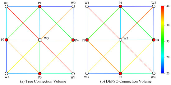 A well was randomly selected, and comparison graphs of its conductivity and connected volume before and after history matching were plotted. The results are shown in Figure 13, Figure 14, Figure 15 and Figure 16. As shown in Figure 17, six production wells were randomly selected, and three optimization methods—DEPSO, PSO, and DE—were used for history matching. Each subplot contains three curves, representing the water-cut changes obtained using different optimization methods. In the figure, the red dotted line represents the historical water-cut data, and the green curve represents the predicted data optimized using the DEPSO algorithm. These data show a high degree of consistency with the historical data, indicating extremely high fitting accuracy. The orange and pink lines correspond to the predicted data from the DE and PSO algorithms, respectively, with their fitting accuracies decreasing in sequence.