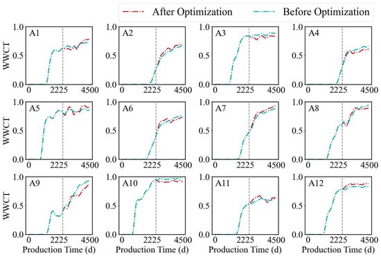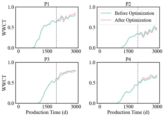 Figure 18 illustrates the changes in WWCT before and after reservoir history matching, along with the predicted WWCT curve over the past 2000 days after history matching. A dashed line is used to mark the boundary between the pre- and post-fitting periods. The red line represents the WWCT changes after fitting, while the blue line represents the WWCT changes before fitting. It can be observed that the fitting results are satisfactory. For each production well, the correlation coefficient R2 between the predicted and actual water cut values is first calculated. Subsequently, the R2 values for all production wells are averaged to obtain the mean water-cut fitting accuracy for the entire set of production wells. Table 4 presents the WWCT fitting rates for all production wells in the reservoir model, with an average WWCT fitting rate of 87.8%.