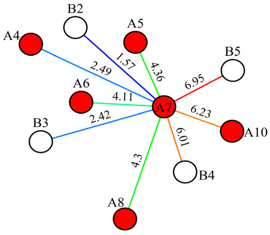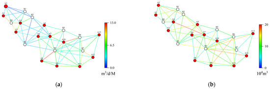 Graph structure establishment. The CRM is conceptualized as a graph structure, where oil wells and water wells are regarded as nodes in the graph. The connectivity between wells is mapped as edges between nodes, and the well-to-well connectivity is parameterized as edge features. Based on this, a connection network from injection wells to production wells is constructed. Considering that the production dynamics of injection–production wells are different at different production time points, the characteristic parameters of the GNN model need to be dynamically adjusted accordingly. Therefore, a specific graph structure is constructed for each extraction time point. Therefore, a specific graph structure is constructed for each mining time point. For a particular extraction, the input features of the injection well node cover the water injection volume at the current extraction time, the total water injection volume, the well location data, the address feature where it is located, and the water content at the last extraction time. Correspondingly, the input features of the production well node cover the fluid production volume at the current extraction time, the total fluid production volume, the well location data, the address characteristics where it is located, and the water content rate at the last extraction time.