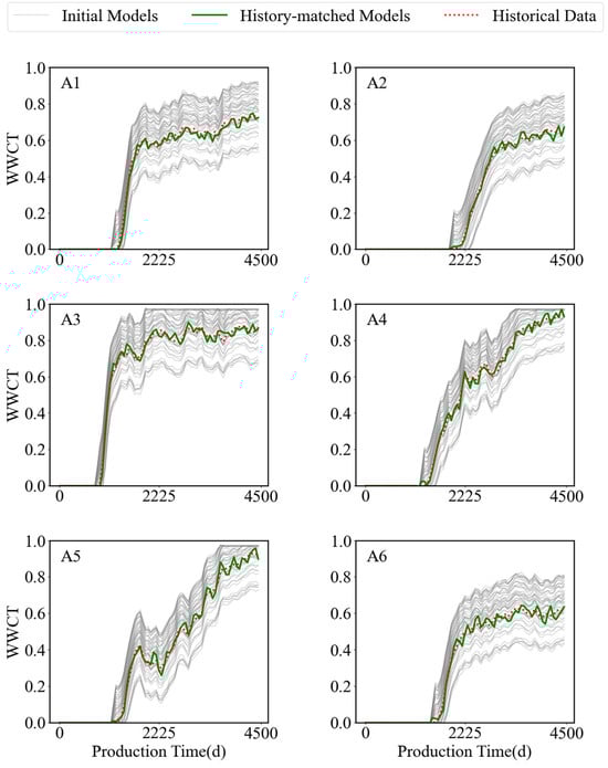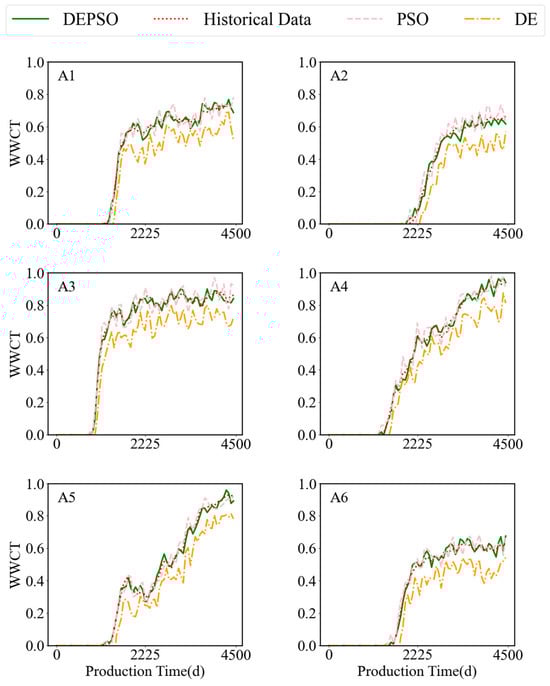 Historical matching results of WWCT curves for 6 production wells using the GNT-DEPSO method.