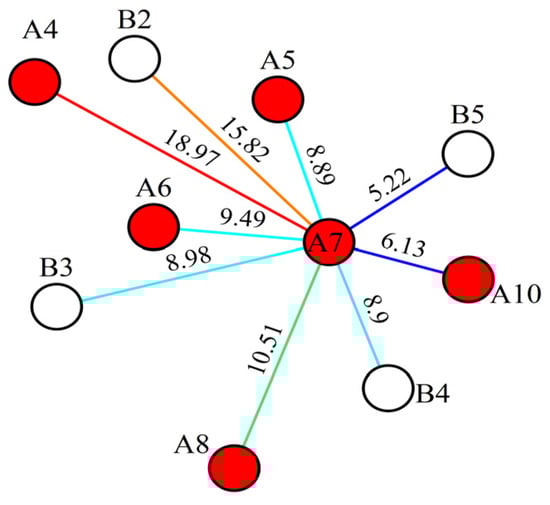 The point locations and connectivity relationships in the conceptual reservoir case study. Among them, red circles represent production wells, and white circles represent injection wells.