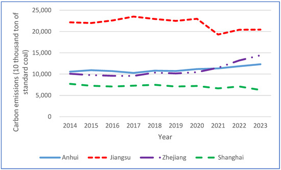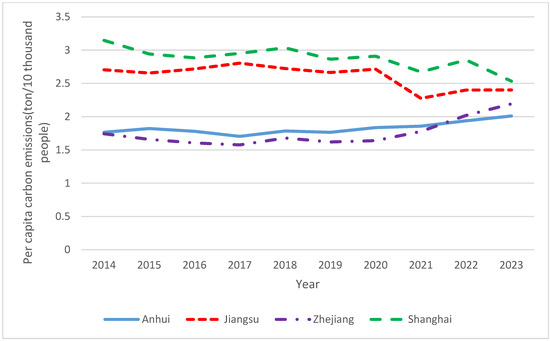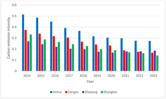 As shown in Figure 1, Jiangsu Province’s total carbon emissions were considerably higher compared to the other three regions. While Anhui and Zhejiang provinces demonstrated an upward trend in carbon emissions, Jiangsu and Shanghai showed a consistent decline. From 2014 to 2023, per capita carbon emissions in Jiangsu and Shanghai remained stable initially, followed by a declining trend (Figure 2). In contrast, per capita carbon emissions in Anhui and Zhejiang showed an upward trend. By 2022, Zhejiang’s per capita carbon emissions had exceeded those of Anhui. After 2022, the overall per capita carbon emissions were highest in Shanghai, followed by Jiangsu, Zhejiang, and Anhui. The carbon emission intensity in the Yangtze River Delta gradually decreased (Figure 3). Anhui exhibited the highest carbon emission intensity, followed by pre-2022 levels in Jiangsu. After 2021, the carbon emission intensity in Jiangsu, Zhejiang, and Shanghai decreased. The differences between each province and the city may be caused by regional heterogeneity between economic development and carbon emissions. The economic volume of Anhui is relatively low; however, it has the highest carbon emission intensity owing to industrial transfer within the Yangtze River Delta region. As a long-developed area, Shanghai’s economy is dominated by a high proportion of service industries, resulting in the lowest carbon emission intensity in the region. Promoting coordinated carbon emission reduction across the Yangtze River Delta is essential to ensuring fairness and scientific rigor in policy formulation. Additionally, it serves as a model for carbon reduction efforts in other regions of China and globally.