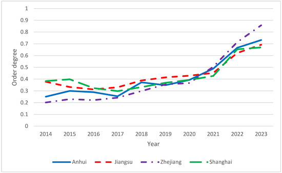 To uncover the trends in carbon emission reduction capability across the four subsystems using the subsystem order degree model, the order degrees of the carbon emission reduction subsystems for the three provinces and one municipality were calculated (Table 8 and Figure 4).