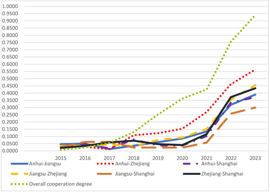 To reveal the cooperative development of carbon emission reduction in the Yangtze River Delta region, the pairwise composite cooperation degree of each subsystem and the overall composite cooperation degree between the study areas were calculated (Table 9 and Figure 5).