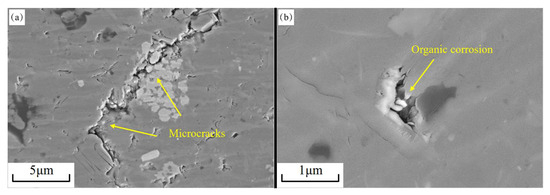 Scanning Electron Microscopy Results of Marine–Continental Transitional Shale. (a) Hydration expansion of clay minerals causing fractures after low-salinity solution treatment; (b) Partial dissolution of organic matter under slick water fracturing fluid treatment; (c) Dissolution of pyrite and siderite by acetic acid solution; (d) Formation of numerous micro-cracks under hydrochloric acid solution treatment.