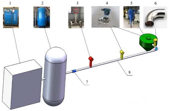 Pneumatic conveying system for gangue particles. 1. Air compressor 2. Gas storage tank 3. Flow meter 4. Pressure transmitter 5. Cyclone separator 6. Elbow 7. The throttle valve 8. Acrylic pipe.
