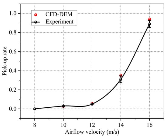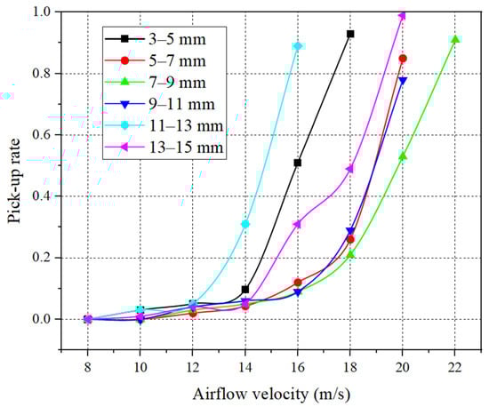 Effect of airflow velocity on the pick-up rate of particles with different sizes.