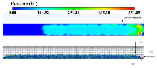 Figure 4 provides a pressure cloud map illustrating the forces exerted by the gas on particle clusters at an airflow velocity of 10 m/s. F1 and F2 represent the forces applied by the airflow, while Ff represents the frictional force exerted by the pipe wall. At this velocity, the picking mass reached 15 g, with a picking rate of 3%. Although the airflow caused some particles to lift from the cluster, the gas velocity was insufficient to mobilize the remaining particles. This outcome suggests that the friction between particles exceeded the force applied by the airflow. However, when the gangue particles adhere to each other, the airflow is not enough to continue blowing the remaining gangue particles, indicating that the force applied by the airflow at this time is smaller than the frictional force between particles.