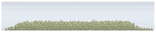 A cylindrical particle factory with a 200 mm length and 50 mm diameter was positioned 400 mm from the pipeline inlet. The factory was set as static, with a particle generation mass of 0.1 kg. For instance, when generating particle 4 (as shown in Table 3), a stationary pile of particle 4 was created, as illustrated in Figure 8.