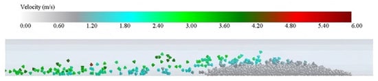 Figure 2 depicts the selection of gangue particles sized 3–5 mm within an acrylic tube under a 16 m/s airflow velocity, as well as the picking behavior of non-spherical particles simulated numerically. The comparison shows a strong correlation between the experimental and simulated flow patterns, validating the accuracy of the CFD-DEM model in describing the gangue particle flow characteristics. Various particle sizes were tested by introducing air at different velocities to analyze the collection behavior across sizes.