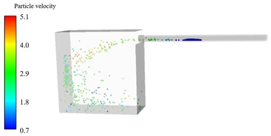 After connecting EDEM and Fluent, simulations were conducted according to the parameters in Table 3. The airflow velocity required to collect 30% of the particle mass within 1 s was defined as the picking speed. During the simulation, gas was introduced into the pipe, gradually picking up particle 4 and causing it to flow along with the gas, as shown in Figure 9. The movement of particles within the pipeline and collection device is depicted in Figure 10, where particles are seen moving in a cluster-like manner with the airflow.
