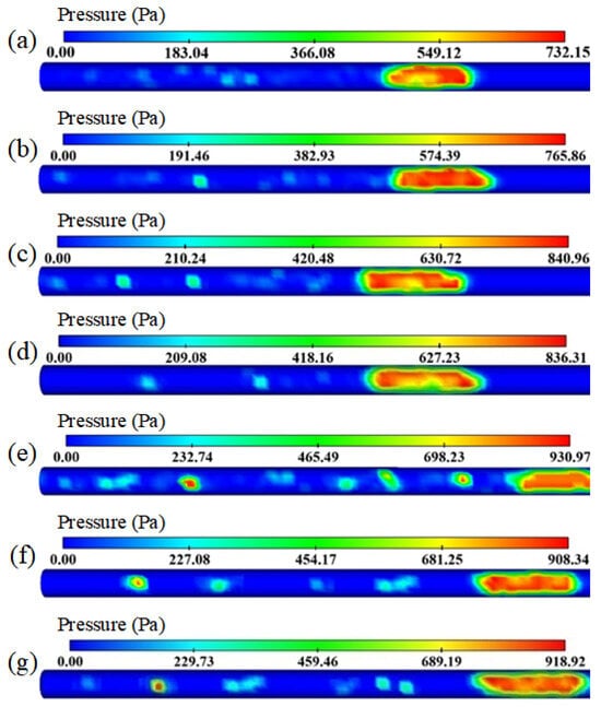 From Figure 4, it is evident that the pressure on particle clusters on the windward side of the pipe wall was higher than on the leeward side. This phenomenon occurs because the windward particles experience direct airflow force, while the compressed airflow in the flow area exerts additional squeezing forces, increasing the friction between the particle cluster and the lower pipe wall.