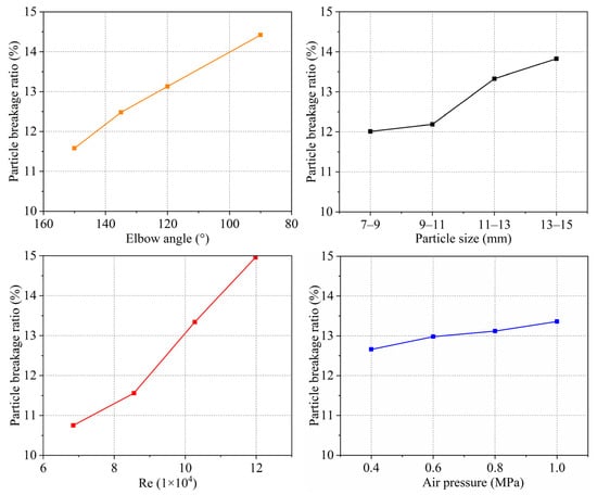 Using the data in Table 9, a relationship curve between factors and the particle breakage rate was plotted (Figure 15). The results show that as the elbow angle increases, the particle breakage rate rises from 11.58% to 14.42%.