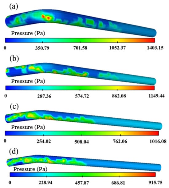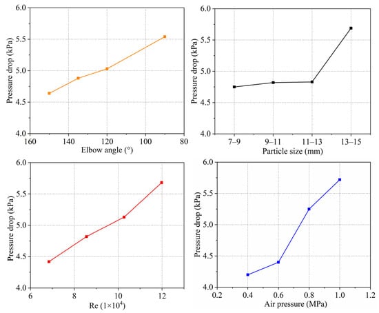 Figure 17 shows that among the tested elbow angles, the smallest pressure drop (4.64 kPa) occurs at a 150° elbow angle, while the largest (5.54 kPa) occurs at a 90° elbow angle. To better understand this trend, simulations were conducted with constant variables (airflow velocity: 30 m/s, particle size: 8 mm, and air pressure: 0.4 MPa) while varying the elbow angle. The results are shown in Figure 18.