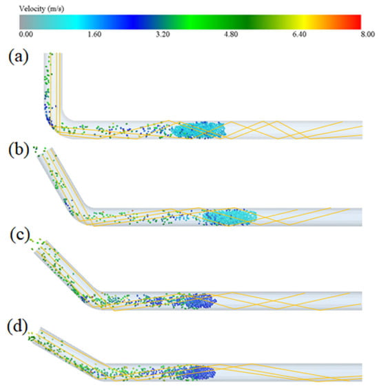 To further analyze this phenomenon, simulations were conducted by varying the elbow angle while keeping the other variables constant. The airflow velocity was set to 30 m/s, the particle size to 8 mm, and the air pressure to 0.4 MPa. The simulation results are shown in Figure 16.