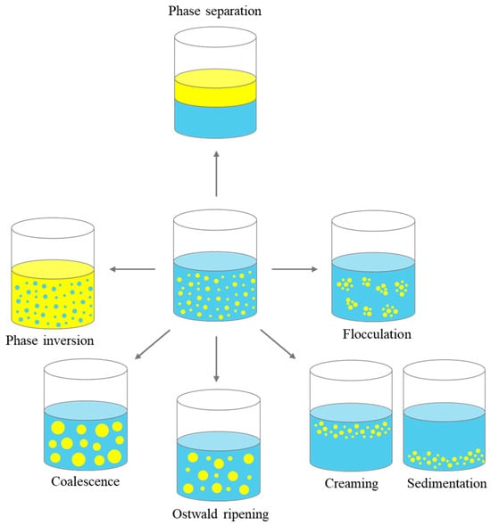 Due to thermodynamic instability, emulsion droplets tend to increase in size, which reduces their interfacial area and lowers their total free energy. Various physical mechanisms contribute to the break-up and instability of emulsions, such as gravitational separation, flocculation, coalescence, Ostwald ripening, and phase inversion (Figure 1).