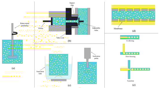 Emulsion production methods: (a) rotor–stator emulsifier; (b) high-pressure homogenizer; (c) ultrasound homogenizer; (d) membrane homogenizer; (e) microfluidic emulsification.