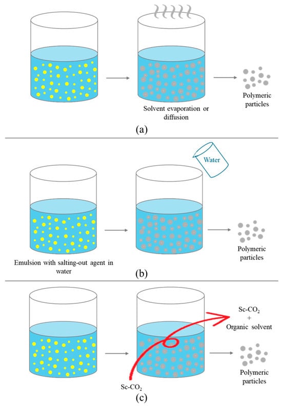 Moving on to the case of polymeric particles, an o/w emulsion is used as a template for particle production. In this case, the composition of the oil phase, also called the organic phase, is modified due to the polymer. Therefore, the polymer is completely dissolved in an organic solvent, forming a polymeric solution that is used as the oil phase. There are a number of general principles that should be considered when selecting a polymer and solvent combination. The selection of the polymer depends on the intended application. Focusing on pharmaceutical, nutraceutical, and food applications, the polymers should be non-toxic, biodegradable, or/and biocompatible. Polymers can be classified as natural, semi-synthetic, or synthetic. Examples of natural polymers include gelatin, casein, chitosan, gum acacia, whey protein, xanthan gum, or sodium alginate [15,74]. The most commonly utilized semi-synthetic polymers are ethyl cellulose and carboxymethyl cellulose. Among the synthetic polymers, polylactides (PLAs), polyglycolides (PGAs), poly(lactide co-glycolides) (PLGAs), polycaprolactone, and polyglycolide are the most commonly utilized. Moreover, the polymer must be completely insoluble in water to facilitate the production of an o/w emulsion. The selection of polymer is also based on the physical properties required for the specific application [75,76,77,78]. Regarding the solvent, its selection is typically based on the chosen polymer. Some of the selection criteria are the ability to dissolve the polymer, immiscibility or poor miscibility with the external phase, and high volatility. Moreover, the physicochemical properties of the solvent must be considered, as properties like surface tension, viscosity, density, and solubility influence particle size. The most used organic solvents are chloroform, dichloromethane, and ethyl acetate [76,79,80].