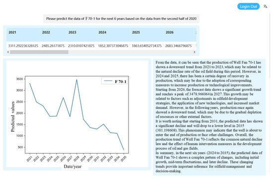 Production data analysis: AGI can analyze production data from wells to forecast future output. By examining historical production records and various factors that may affect production, such as reservoir pressure, fluid properties, and equipment performance, these models can provide accurate predictions of future production trends. This enables companies to plan their operations and investments more effectively, optimize production strategies, and allocate resources rationally to maximize production efficiency and economic benefits. In this study, AGI’s primary focus lies in establishing a collaborative framework between large foundational models and domain-specific small models to enhance adaptability and interpretability in production forecasting [55]. As shown in Figure 5, we developed a large model product based on a knowledge base constructed from data from a certain block of coalbed methane in China. Then, we quickly predicted the production changes of a certain well in the next 10 years through question and answer and conducted a detailed analysis.