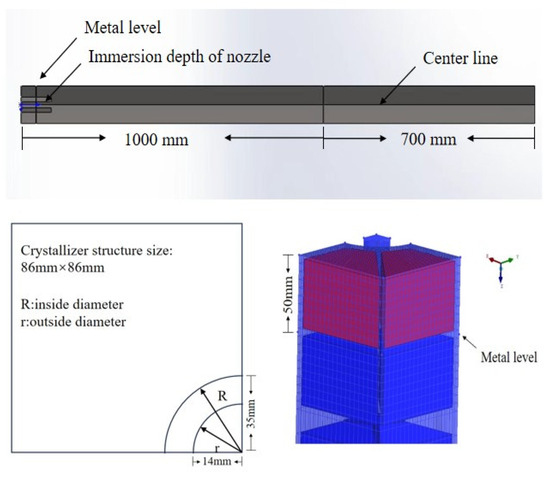 In this study, a numerical model was developed for the continuous casting mold of square billets with dimensions of 172 mm × 172 mm. The model was based on real industrial dimensions to ensure both simulation accuracy and practical applicability. A straight-tube submerged entry nozzle (SEN) was selected instead of a side-port design, primarily to mitigate the risk of steel breakout caused by the high-velocity fluid erosion of the thin initial shell—an especially important consideration for small-section billets. Figure 1 illustrates the continuous casting mold, including both the overall dimensions and the mesh configuration. The mold length was set to 1000 mm to meet simulation requirements. To ensure the development of turbulent flow and avoid backflow phenomena in ANSYS Fluent simulations, the computational domain was extended by an additional 700 mm below the mold.