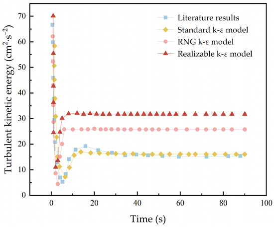 To verify the accuracy of the simulation model used in this study, the effect of casting speed on the turbulent kinetic energy at the center of the mold liquid surface was compared to the results from Qiu et al. [31]. Figure 5 presents a comparison of the simulation results under different turbulence models with those from Qiu et al. The simulation parameters are as follows: a casting speed of 5 m·min⁻1 and nozzle immersion depth of 80 mm.