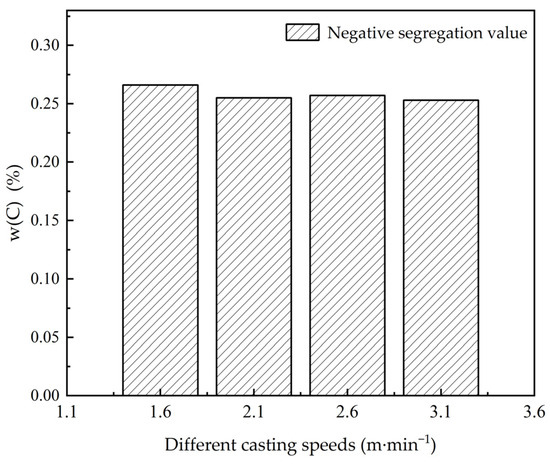 Due to the relatively short period of time, it is difficult for the solute elements to fully diffuse and aggregate in the central region. Therefore, the development of central segregation has been alleviated to some extent. Figure 18 shows the variation in negative segregation values under different casting speeds. From the figure, it can be seen that at a casting speed of 1.6 m·min−1, the negative segregation value reaches a maximum of 0.266%, whereas when the casting speed is increased to 3.1 m·min−1, the negative segregation value decreases to a minimum of 0.253%, with a difference of 0.013%. This result indicates that an increase in casting speed intensifies the flow of molten steel, further promoting the redistribution of solute elements and the formation of segregation, resulting in an increase in the degree of negative segregation.