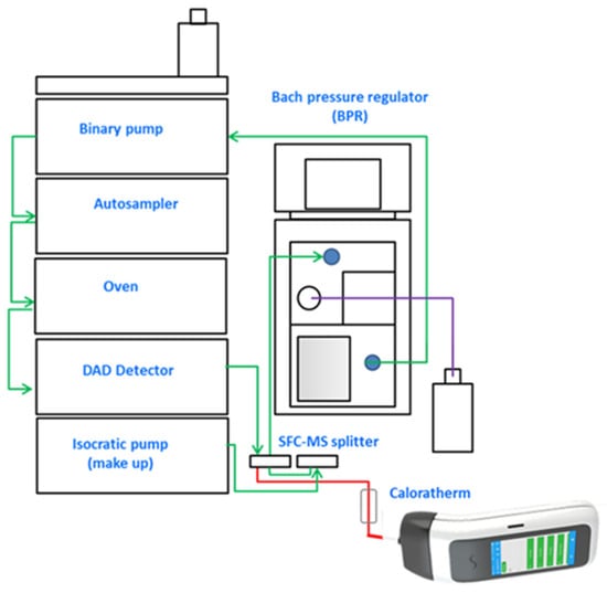 The full setup is introduced in Figure 1. SFC-UV experiments were performed on a 1260 Infinity Analytical System (Agilent Technologies, Santa Clara, CA, USA) consisted of a SFC binary pump, a degasser, a SFC autosampler with a 5 μL loop, an Aurora SFC Fusion ™ A5 module, and a column oven compartment. Detection was performed using a diode array detector (DAD) at a fixed wavelength of 210 nm ± 4 nm (reference 360 nm ± 10 nm), and an acquisition frequency of 1.25 Hz. Instrument control and data collection were carried out using MassHunter Workstation software (B.10.00, Agilent Technologies, USA).